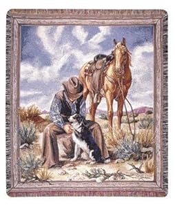 Product Description : Cowboy Relaxing In Desert Tapestry Throw Item #TPM698 Every cowboy needs a friend or two and in this gorgeous tapestry throw designed by Pat Lehmkuhl, there's a quiet moment on the plain for this cowboy and his black and white dog and golden colored horse. Approximate measurements: 50" x 60" Material(s): 100% cotton Washing Instructions: Machine wash cold/tumble dry low Made in the USA